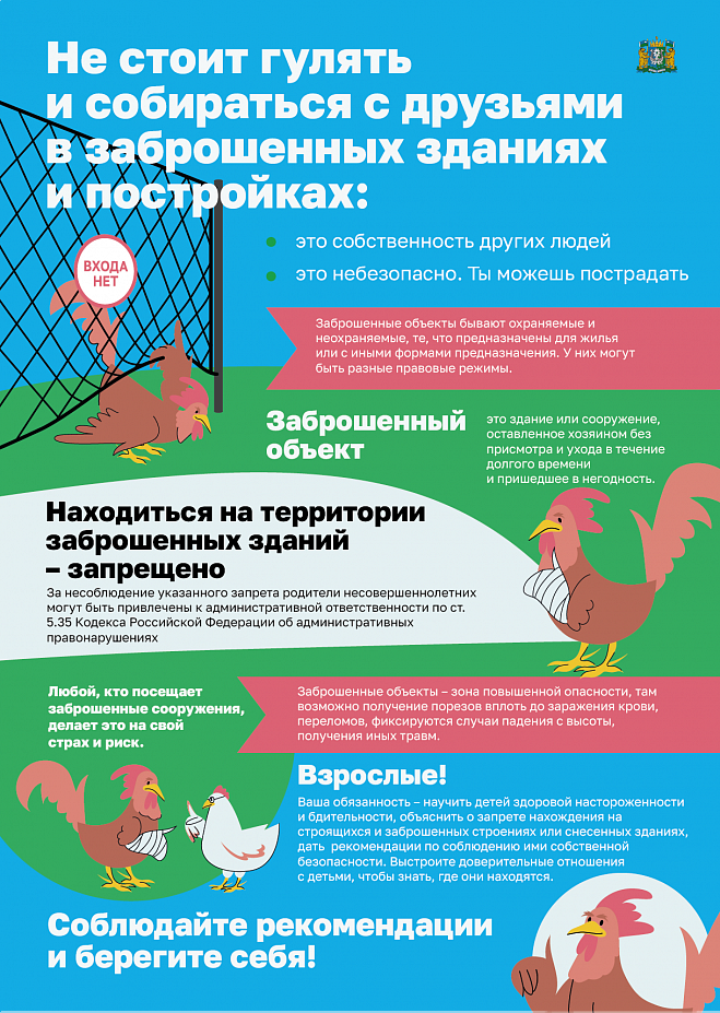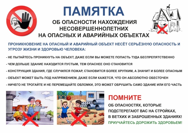 Убедительно просим вас провести беседы со своими детьми, объяснить им степень опасности нахождения на таких объектах. Научите детей говорить «нет» ребятам, которые хотят втянуть их в опасную ситуацию (например, зовут пойти посмотреть, что происходит на стройке, разжечь костёр, забраться на чердак дома или его крышу). Напоминайте об опасности, которая подстерегает в ветхих строениях, заброшенных зданиях.